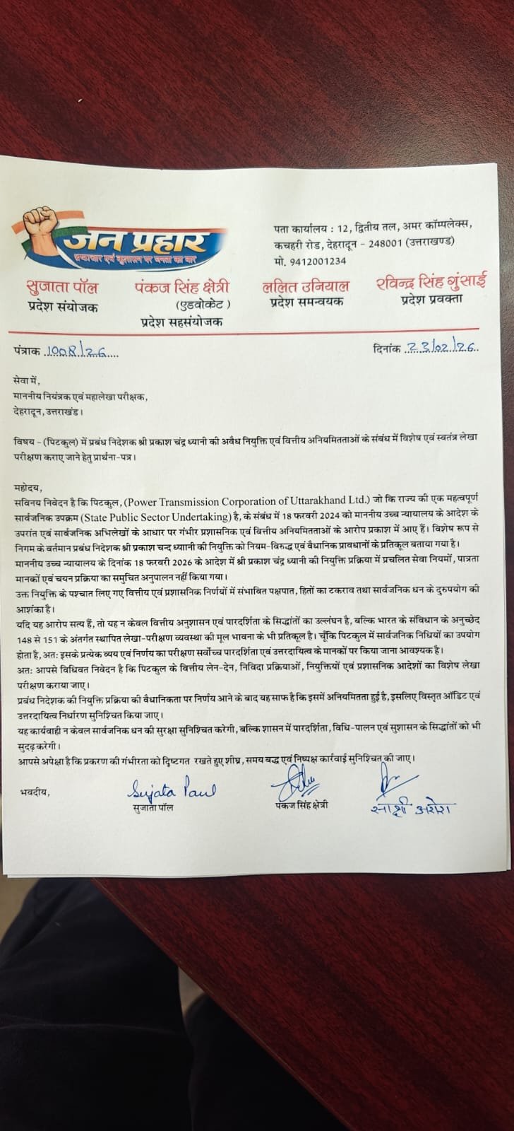 पिटकुल में प्रबंध निदेशक की नियुक्ति एवं वित्तीय अनियमितताओं की जांच हेतु विशेष ऑडिट की मांग जन संगठन जन प्रहार ने आज Comptroller and Auditor General of Uttarakhand को एक औपचारिक प्रार्थना-पत्र प्रेषित कर Power Transmission Corporation of Uttarakhand Limited (पिटकुल) में कथित प्रशासनिक एवं वित्तीय अनियमितताओं की उच्चस्तरीय, स्वतंत्र एवं विशेष लेखा परीक्षा (Special Audit) कराने की मांग की है। प्रेस को जारी बयान में जन प्रहार के पदाधिकारियों ने कहा कि पिटकुल के वर्तमान प्रबंध निदेशक श्री प्रकाश चंद्र ध्यानी की नियुक्ति प्रक्रिया को लेकर गंभीर प्रश्न खड़े हुए हैं। 18 फरवरी 2026 को माननीय उत्तराखंड उच्च न्यायालय द्वारा पारित आदेश के उपरांत यह तथ्य सामने आया है कि नियुक्ति प्रक्रिया में प्रचलित सेवा नियमों, पात्रता मानकों एवं वैधानिक औपचारिकताओं का समुचित अनुपालन नहीं किया गया।